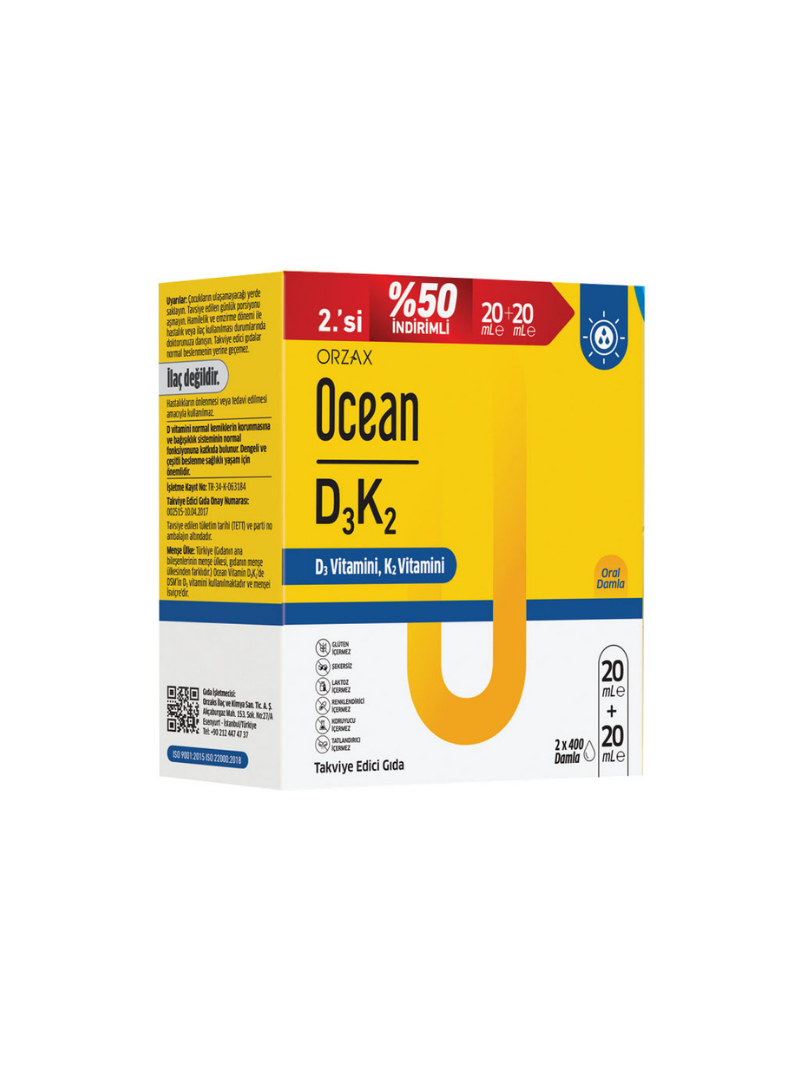 Ocean Orzax Vitamin D3K2 Damla 20 ml 2’li Set, kemik ve bağışıklık sistemini desteklemeye yardımcı olan D3 ve K2 vitamini kombinasyonunu avantajlı paket halinde sunar. Kalsiyumun vücutta daha etkin kullanılmasına katkı sağlayabilecek bu formül, günlük vitamin desteği için pratik bir çözüm sunar.