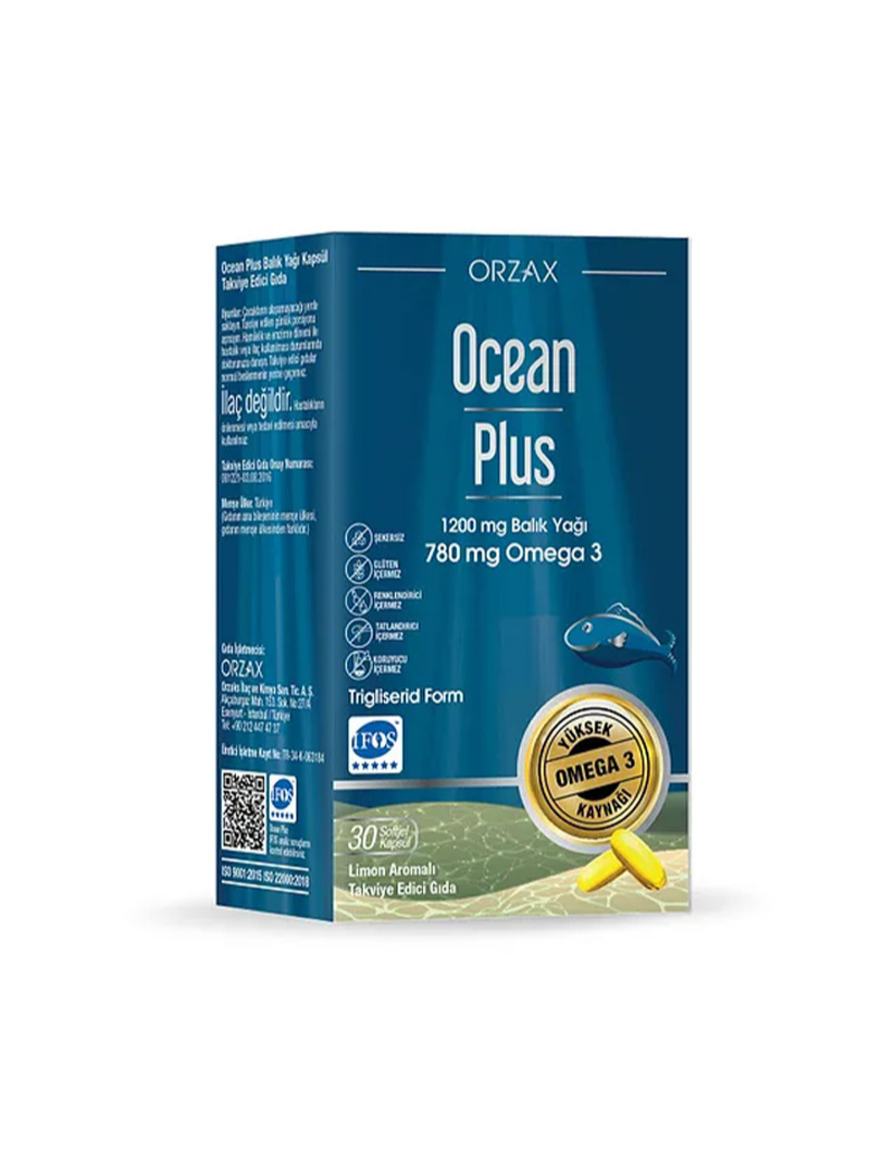 Orzax Ocean Plus 30 Kapsül, yüksek kaliteli balık yağından elde edilen Omega-3 yağ asitleri (EPA ve DHA) içeren takviye edici gıdadır. EPA ve DHA, kalp, beyin ve göz sağlığının korunmasında önemli rol oynayan temel yağ asitleridir.